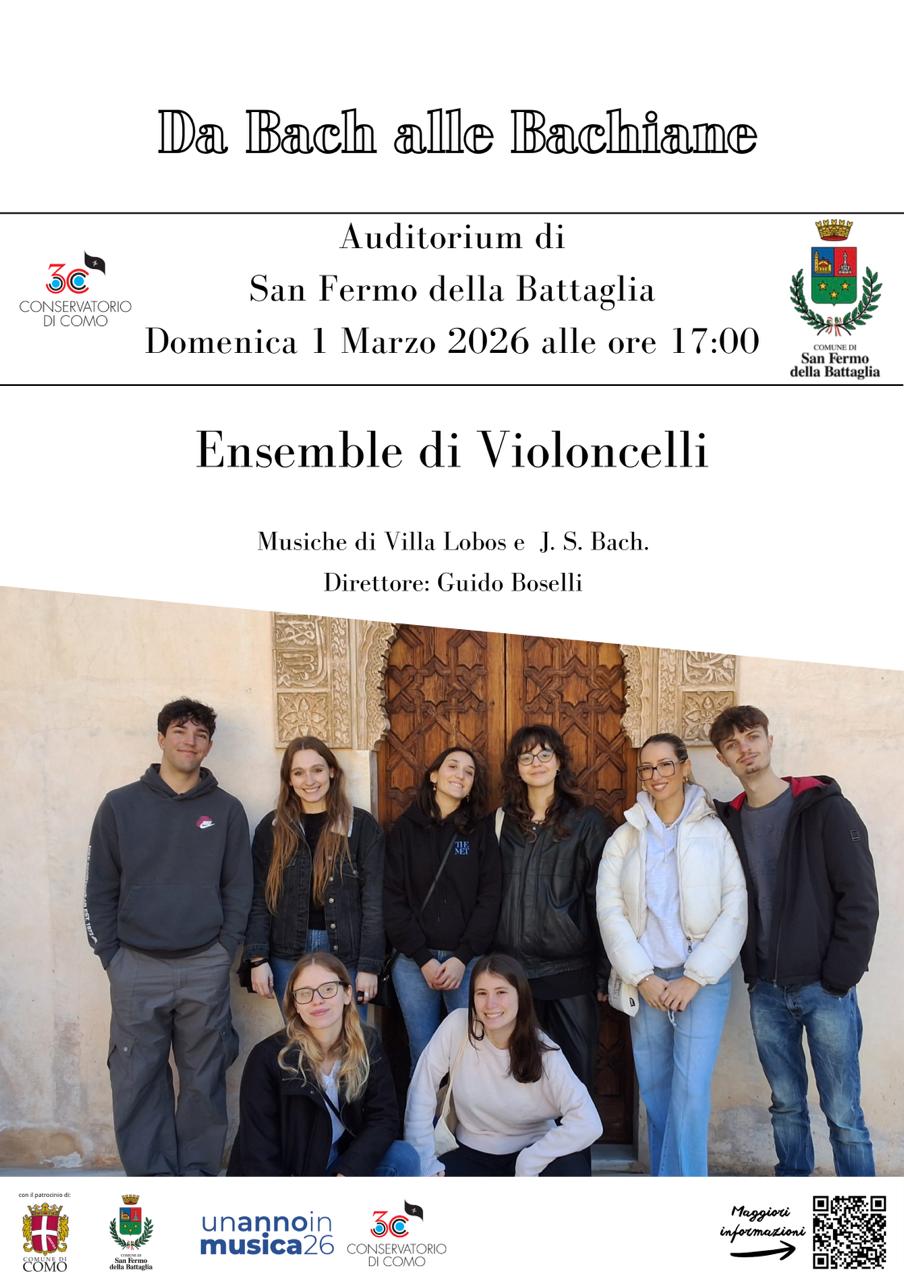 Secondo concerto 2026 del Conservatorio a San Fermo. Dopo il successo del concerto di improvvisazione jazz tocca a “Da Bach alle bachiane”. Sotto la direzione del maestro Guido Boselli, l’ensemble di 16 violoncelli del Conservatorio di Como si esibirà su musiche di Bach e di Villa Lobos con l’inserimento di un brano di Antonio Lotti e Orfeo Mandozzi. L’ensemble di violoncelli è composto da: Daniele Bogni, Virginia Astori, Shanti Avanzi, Riccardo Binda, Alice Castracane, Marta Comunetti, Maria Ghilotti, Tommaso Losito, Edoardo Mantelassi, Stefania Massimo, Matilde Mazzadri, Elisa Missaglia, Alessio Molinari, Camilla Rossi, Chiara Torlaschi, Zen Xiangyi.