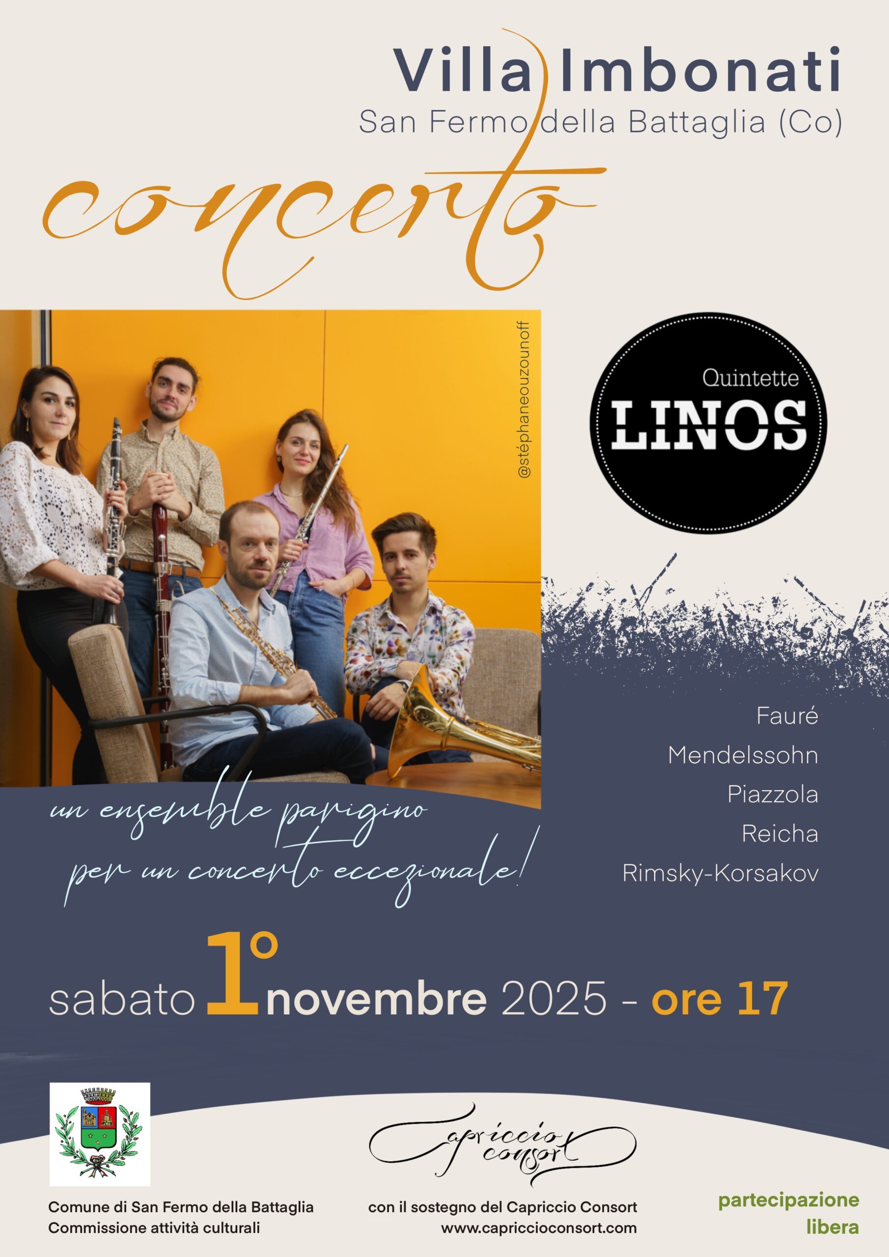 Un concerto particolare dal sapore internazionale, il quintetto Linos suonerà a Villa Imbonati Sabato 1 novembre alle ore 17. Vengono dalla Francia, sono i musicisti del quintetto Linos: flauto, Anna Killy Morin; oboe, Guillaume Retail; clarinetto, Lise Mariage; corno, Victor Ouzounoff e fagotto, Romain Jody.